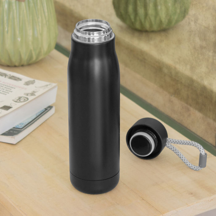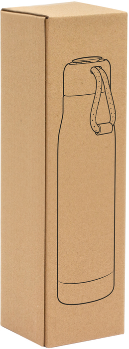 Botella con aislamiento térmico vacuum. Interior de acero 304 y exterior de acero 201. Tapa plástica PP + Anillo de silicona antiderrame. Posee además tira de color gris de 12 cm de largo. Ideal para llevarla a todos lados. Mantiene hasta 12 hs la temperatura de las bebidas calientes y 24 hs de las bebidas frías. Presentación en caja de regalo Kraft.