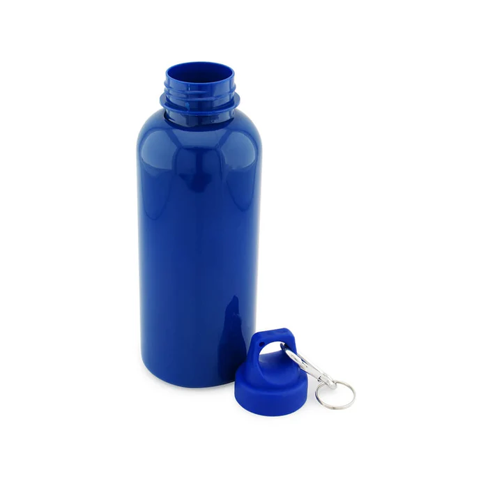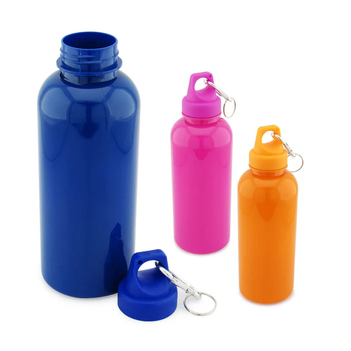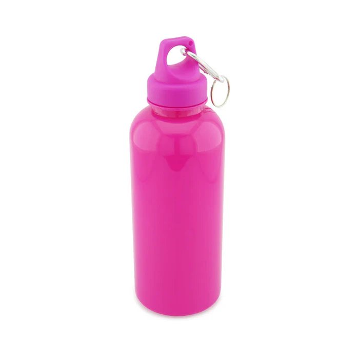 Botella elaborada en plástico, tipo caramañola con mosquetón para colgar.