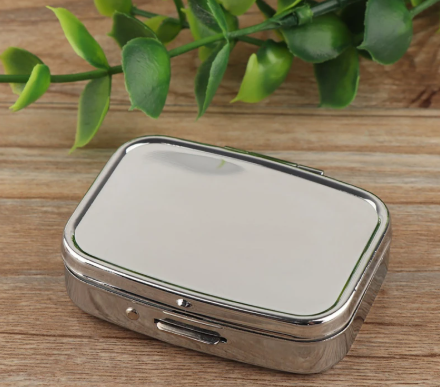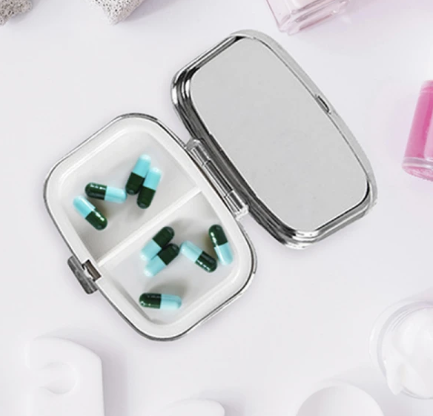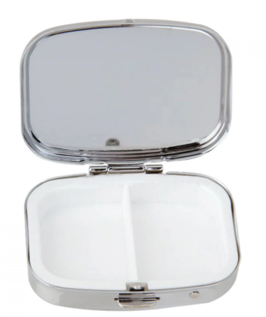 Rectangular con espejo estándar y compartimiento para pastillas. De 5 X 3.5 cm.