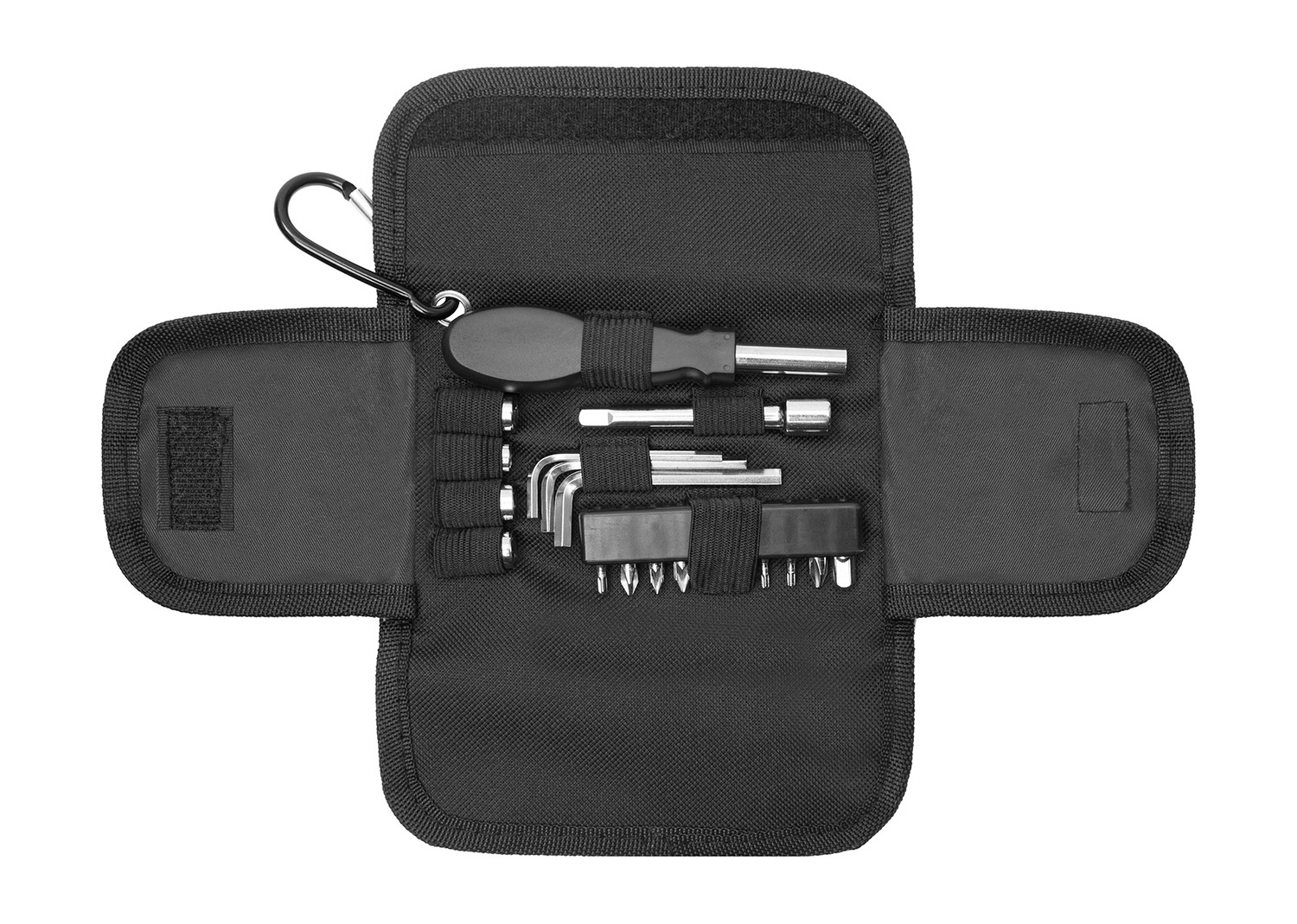 - Set de herramientas de 19 piezas. Destornillador con 10 puntas diferentes, 3 llaves Allen, 4 llaves tubo de 4 medidas y alargue. Estuche con cierre de velcro y gancho.