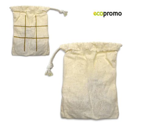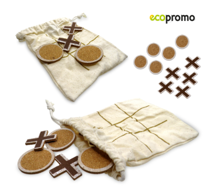 - Juego triqui fabricado en corcho natural con 5 fichas circulares y 5 fichas en cruz. En bolsa de algodón con cierre de cordón que sirve como tablero para jugar.