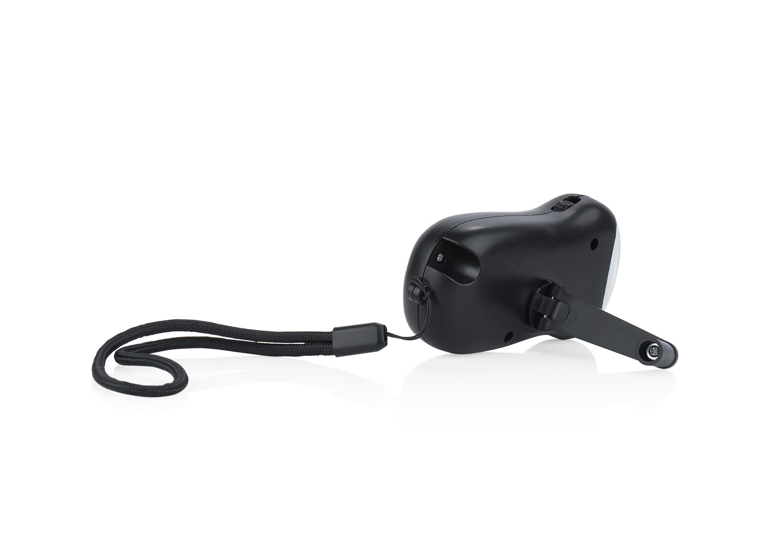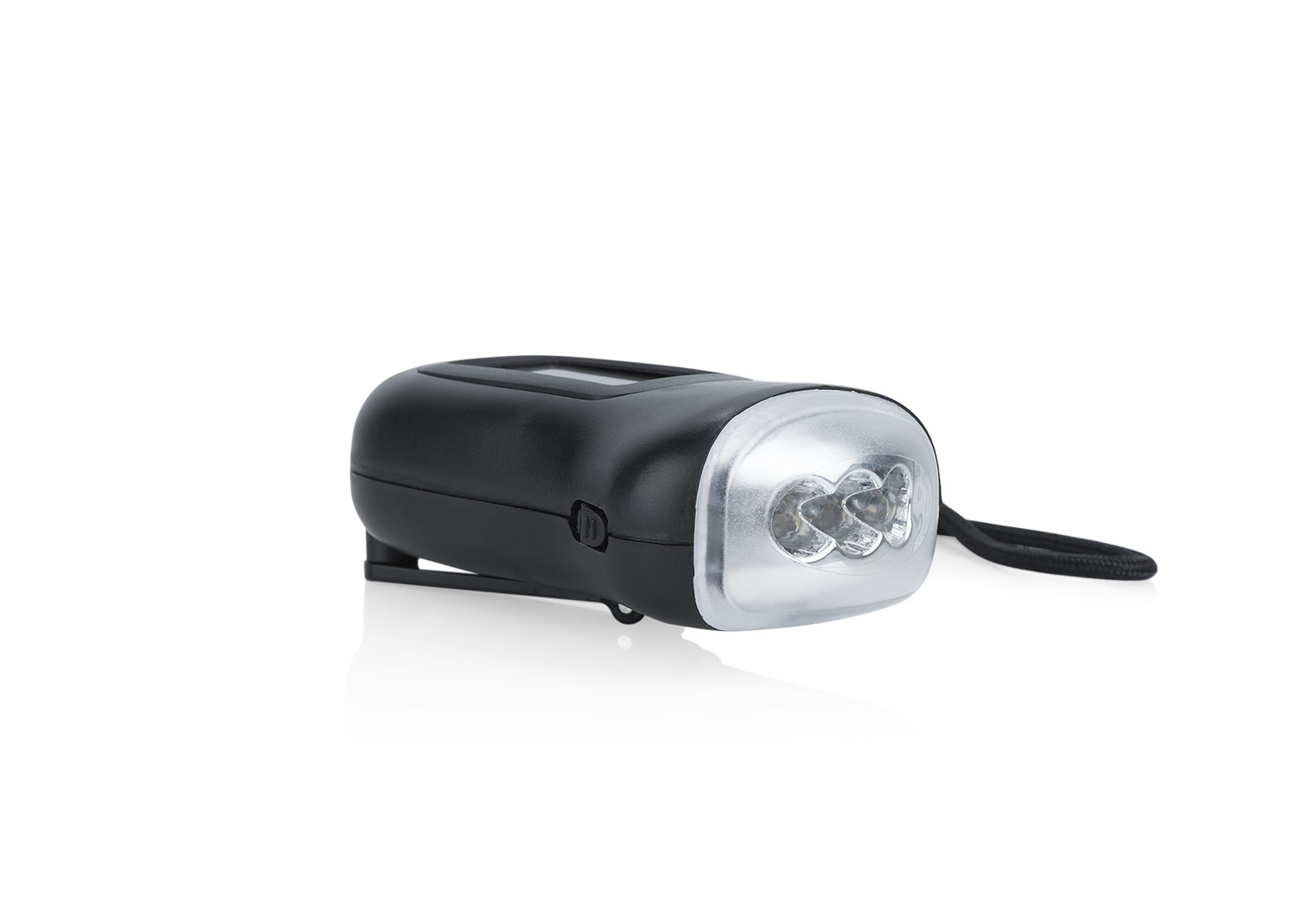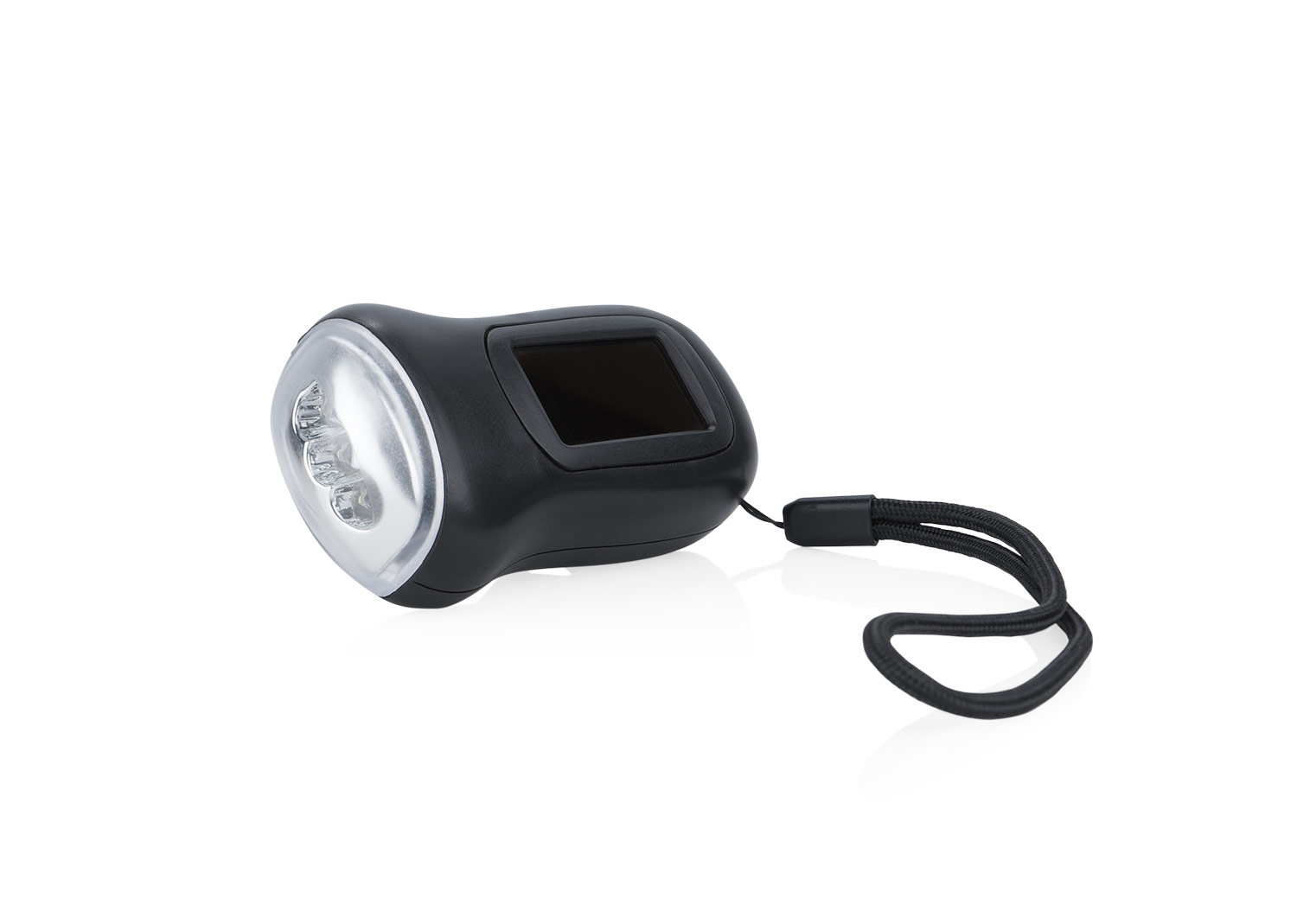Linterna de funcionamiento solar y de dinamo, ecológica. Tiene cordón para transportarla. Ideal para situaciones de emergencia o iluminar espacios muy pequeños en detalle.