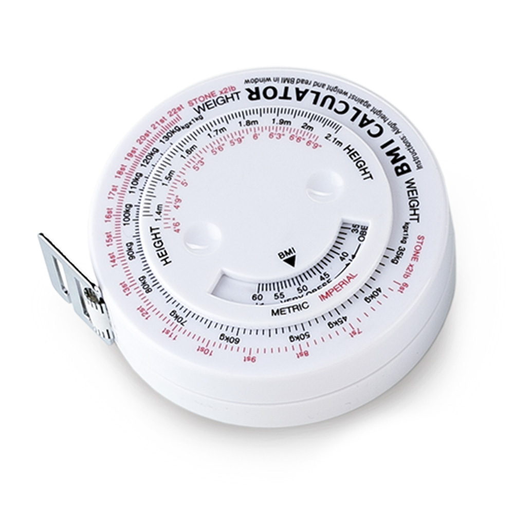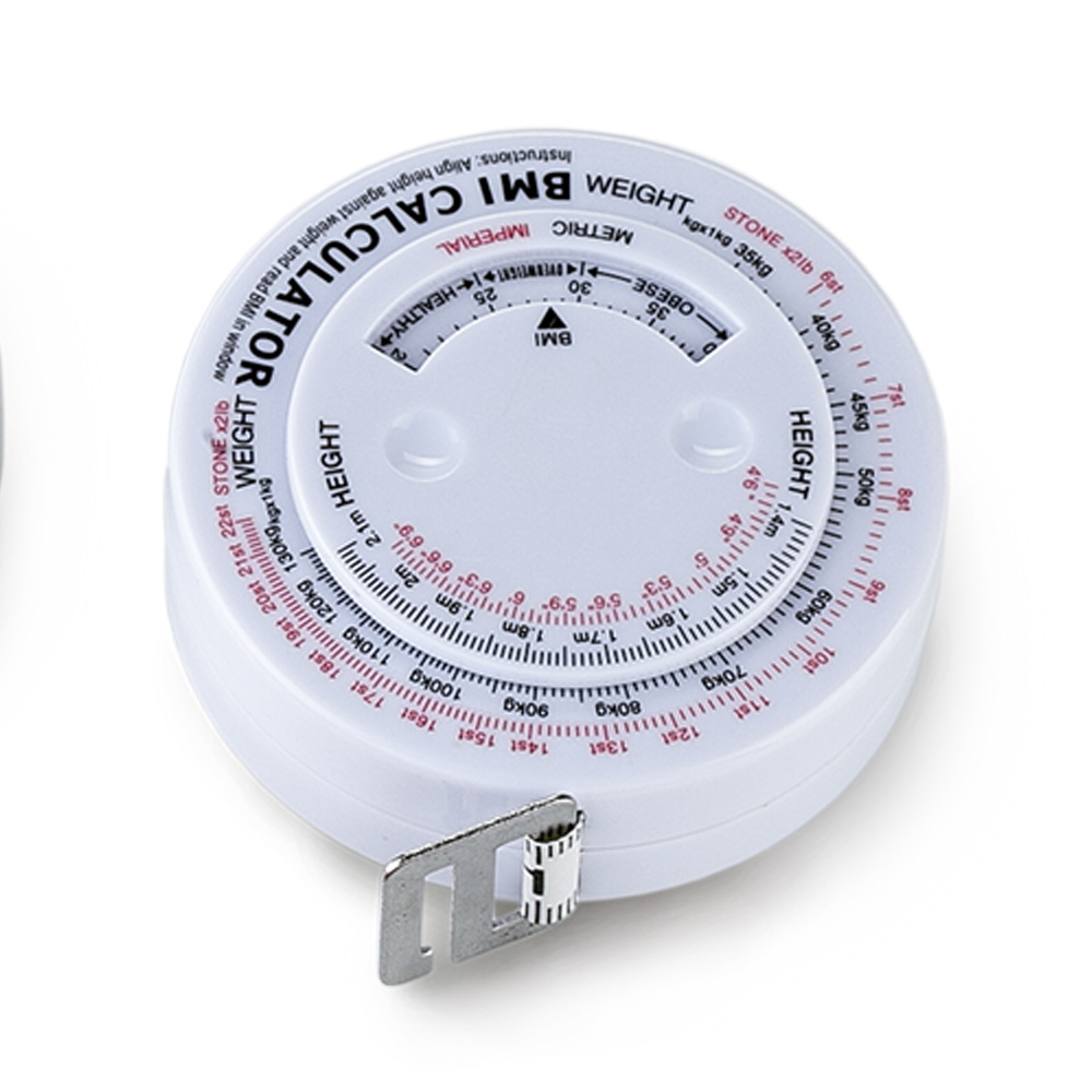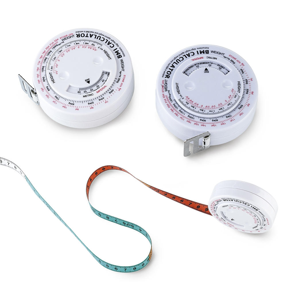 Metro en plástico para calcular el índice de masa muscular, con botón para recoger la cinta.