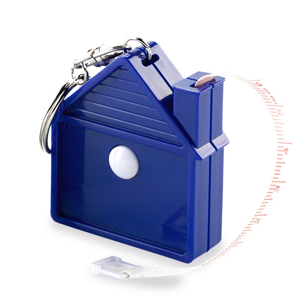 Llavero metro de 1.50 m en plástico con botón de presión para recoger la cinta.