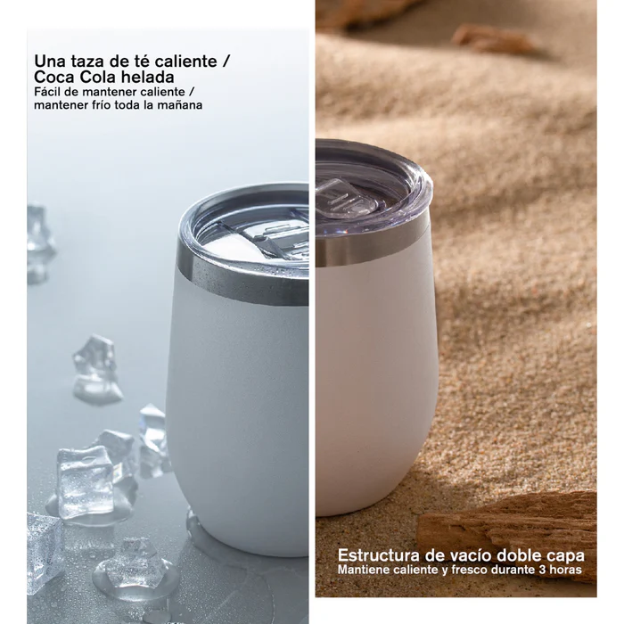 Mug metálico con doble pared en acero inoxidable con aislamiento térmico que mantiene la bebida fría entre 8 a 10 horas, o caliente 3 a 4 horas.