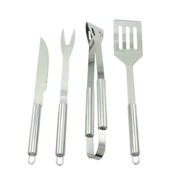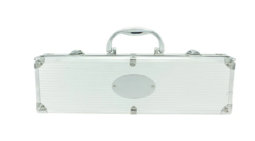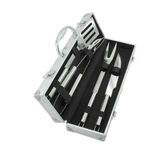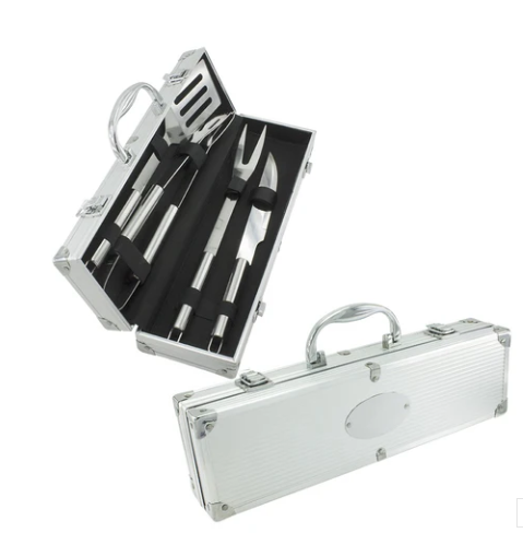 Caja en aluminio con cuatro utensilios para asados: Cuchillo, Pinzas, Tenedor y Espátula.