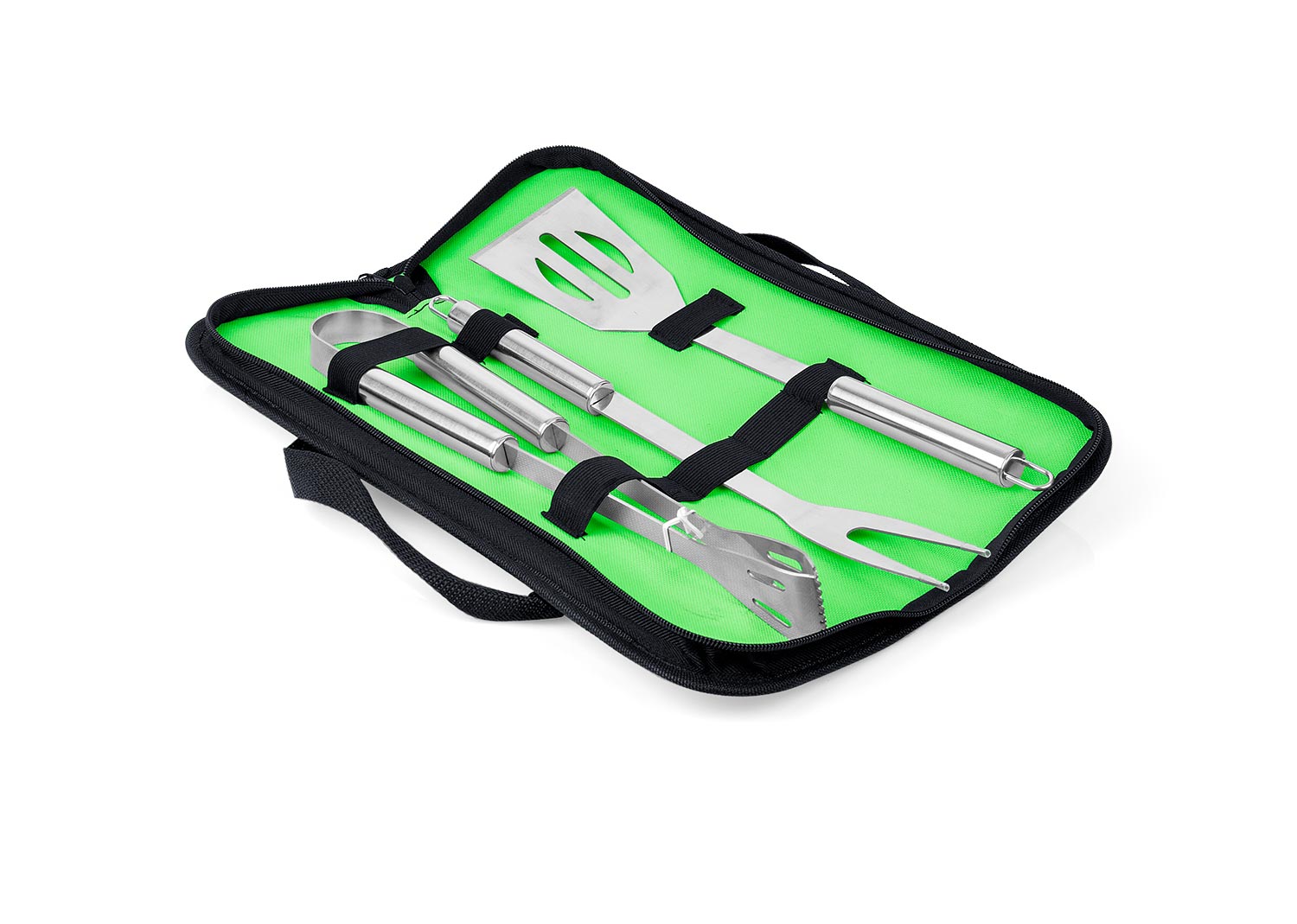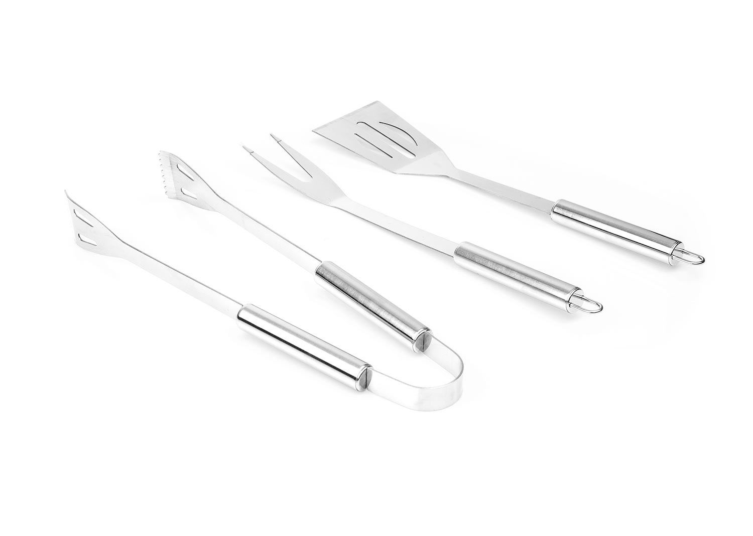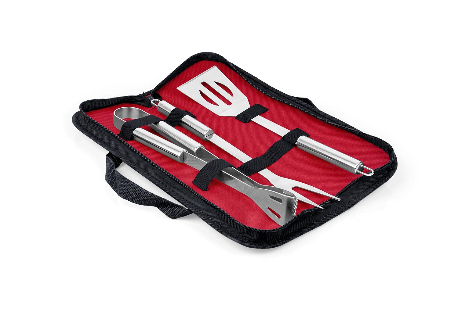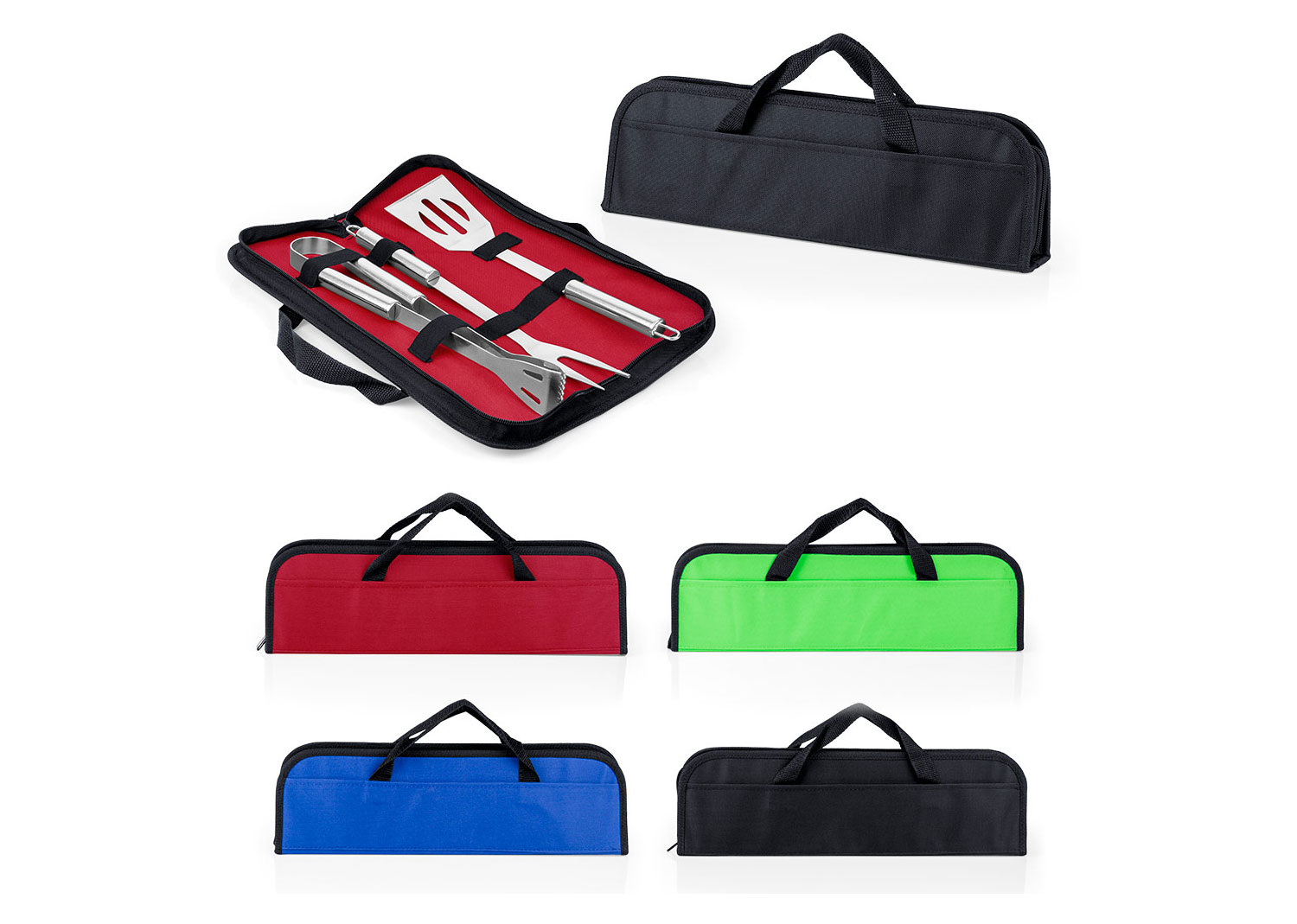 Set de BBQ 3 piezas. Incluye: espátula, pinza y tenedor en práctico estuche con doble agarradera.