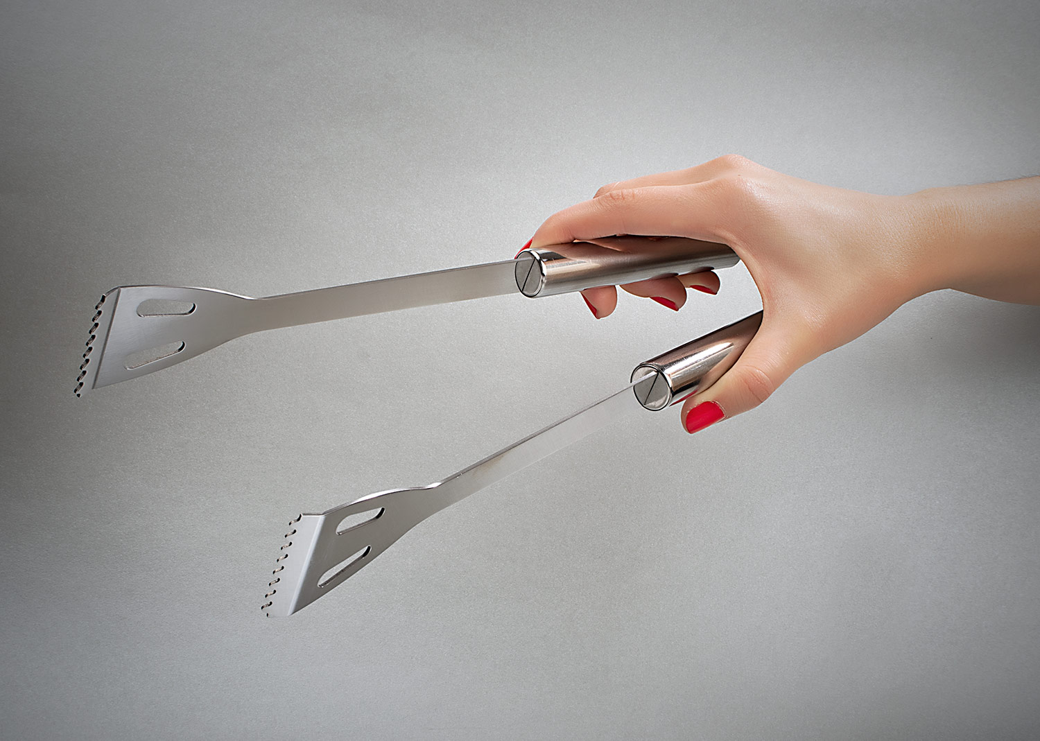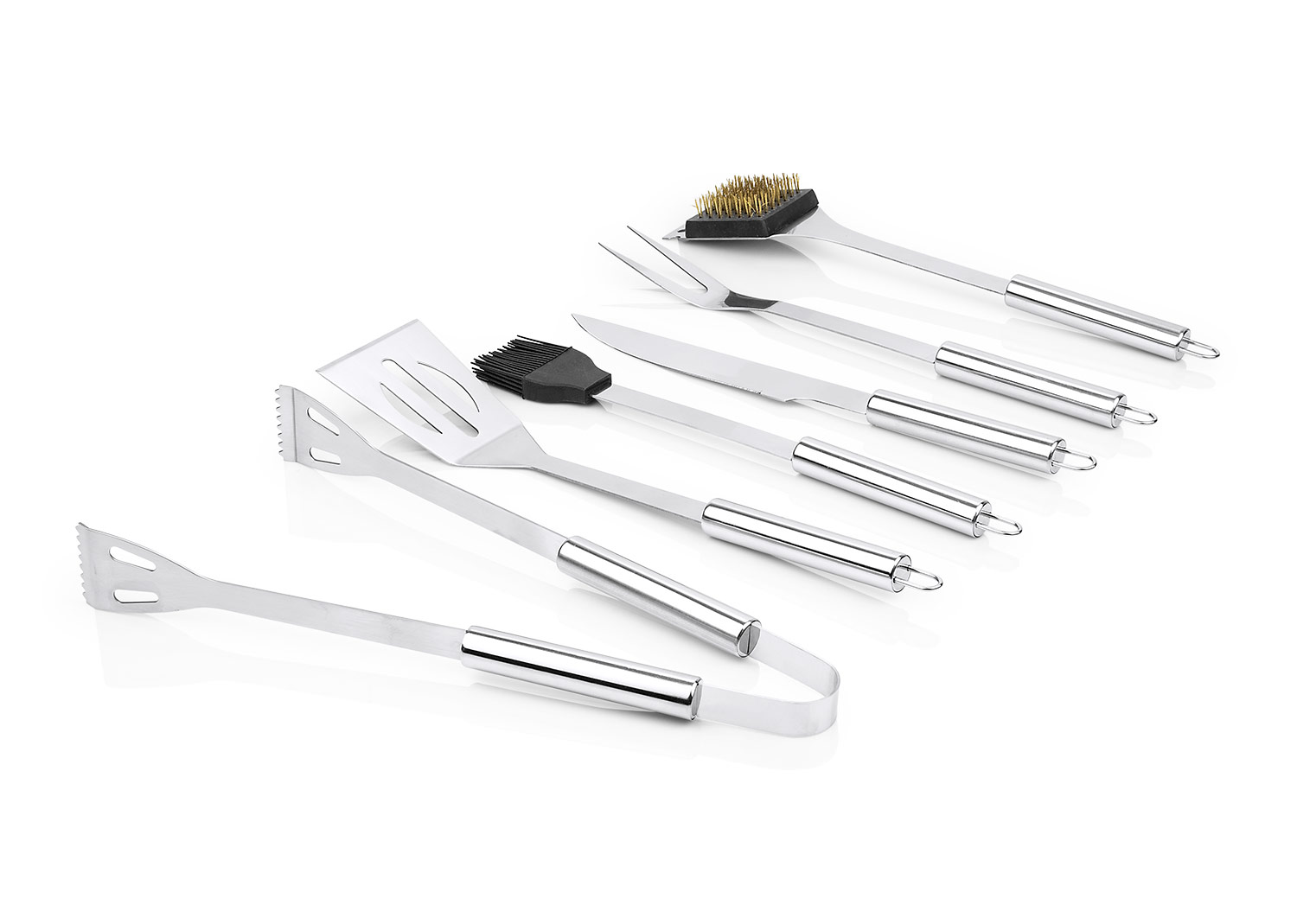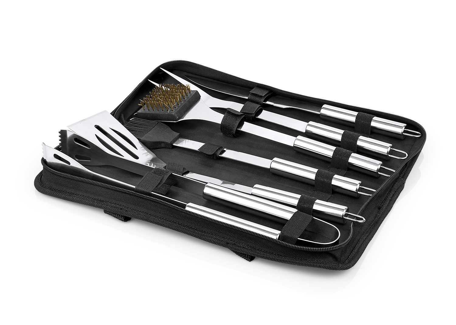 Set BBQ x 6 piezas en Acero inoxidable. Incluye: Pinzas de parrilla, Cepillo para limpiar, Pala barbacoa, Brocha, Cuchillo, Tenedor de parrilla, con estuche textil, cierre en cremallera y manijas.