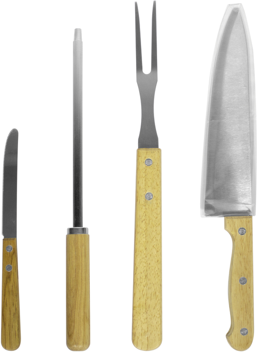 Set de asado de 5 piezas: tabla de bambú, tenedor asador, cuchilla, cuchillo y chaira para afilar, todos con mango de madera barnizados. Presentación en caja de regalo.