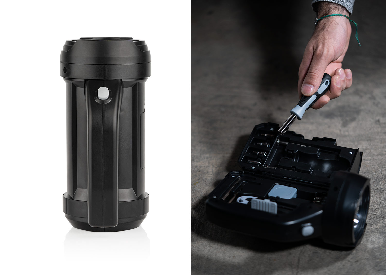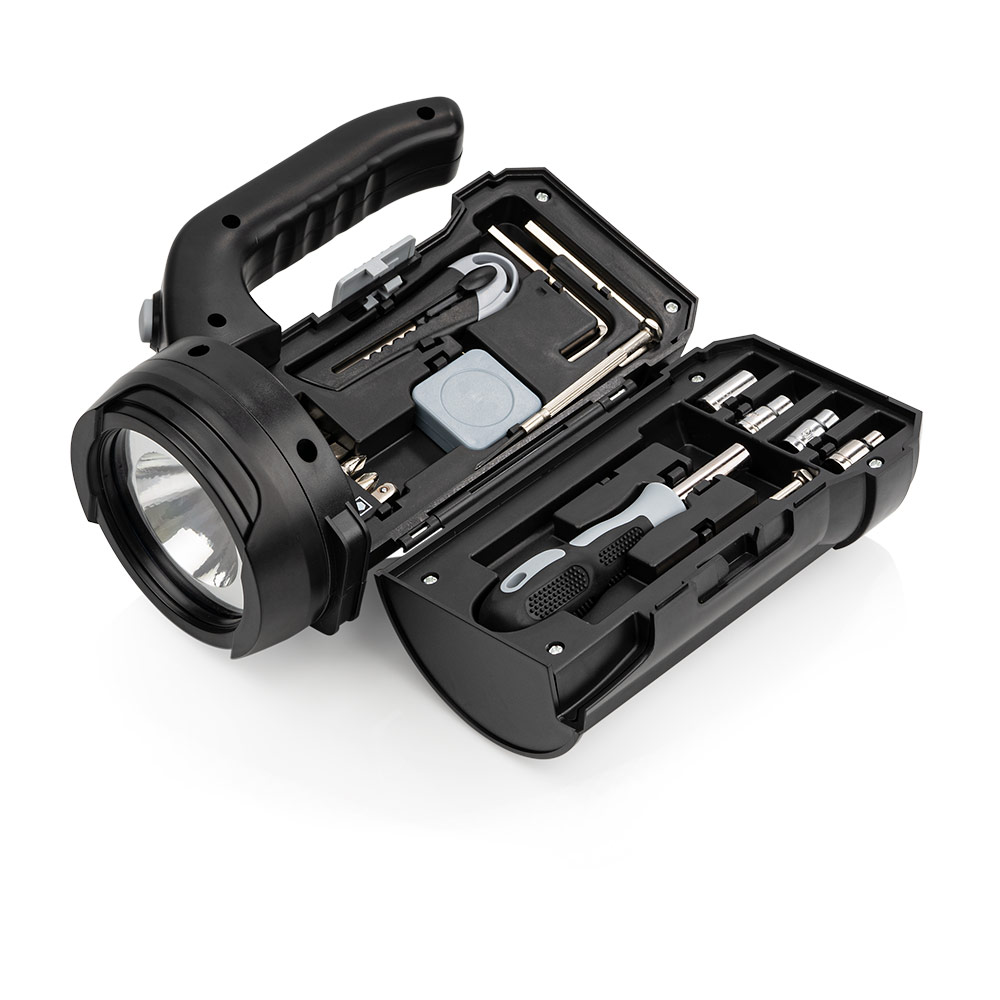 Caja de herramientas con linterna LED externa (3 pilas AA no incluidas). Incluye 4 copas estándar, 6 puntas de destornillador, 2 destornilladores de precisión, un portapuntas magnético, 1 bisturí, 2 llaves hexagonales y 1 cinta métrica de 1 metro (39 pulgadas).