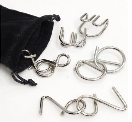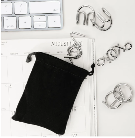 4 Rompecabezas metálicos individuales en bolsa de terciopelo.